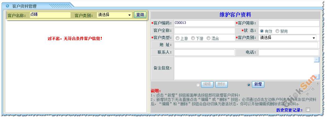 在添加客户信息之前,请先查找系统上是否已经存在相应的客户名称,再确定是否需要增加客户信息。如:需添加客户名为“点晴”,先查找“点晴”,系统显示找不到相应记录,再进行新增客户信息。