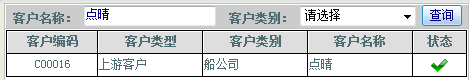 有一种特殊情况,某一公司所属的类别不只一种,如,“点晴”所属的类别既然是“船公司”又是“车队”,如下图所示,从系统上查出的结果可看出“点晴”已经存在,且其客户类别为“船公司”