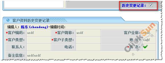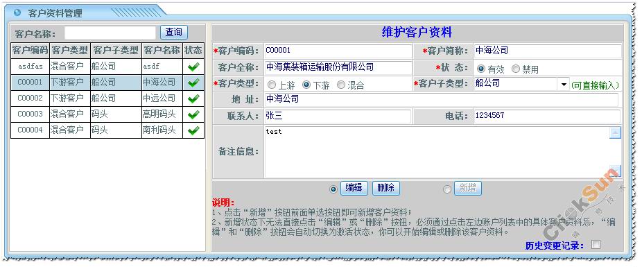 在客户信息列表中,点取某一客户名称,右边维护资料方块则显示了所选取的客户详细信息。 修改客户的信息,然后点击【编辑】保存修改信息。 点击【删除】删除所选取的客户信息。 3、查看历史变更记录
