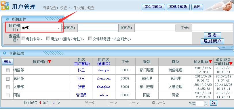 管理员账号登陆系统——设置——系统维护设置——用户账号管理——系统用户管理,部门选择“全部”,在“英文用户名”处填写需查找的用户名,如下图所示: