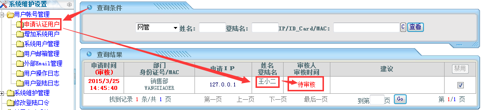 管理员账号登陆系统——设置——系统维护设置——用户账号管理——申请认证用户;点击进入如下页面: